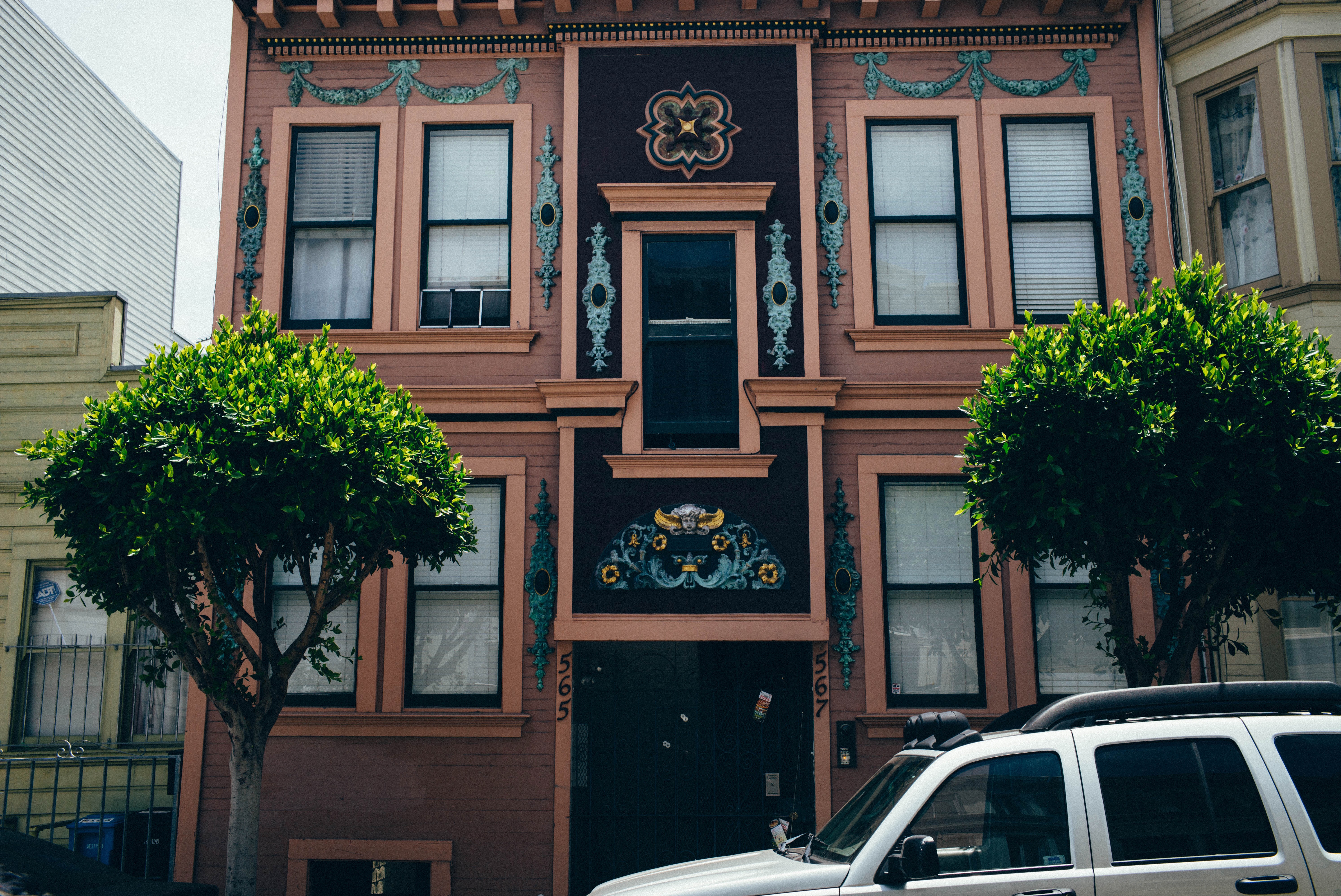 This photograph captures a charmingly ornate building adorned with intricate floral designs, exuding a sense of historical character. The warm, peachy tones harmonize with the lush greenery of trimmed trees flanking the entrance, creating a serene and inviting atmosphere. Sunlight gently illuminates the facade, enhancing the vibrant colors and casting soft shadows that add depth to the composition.