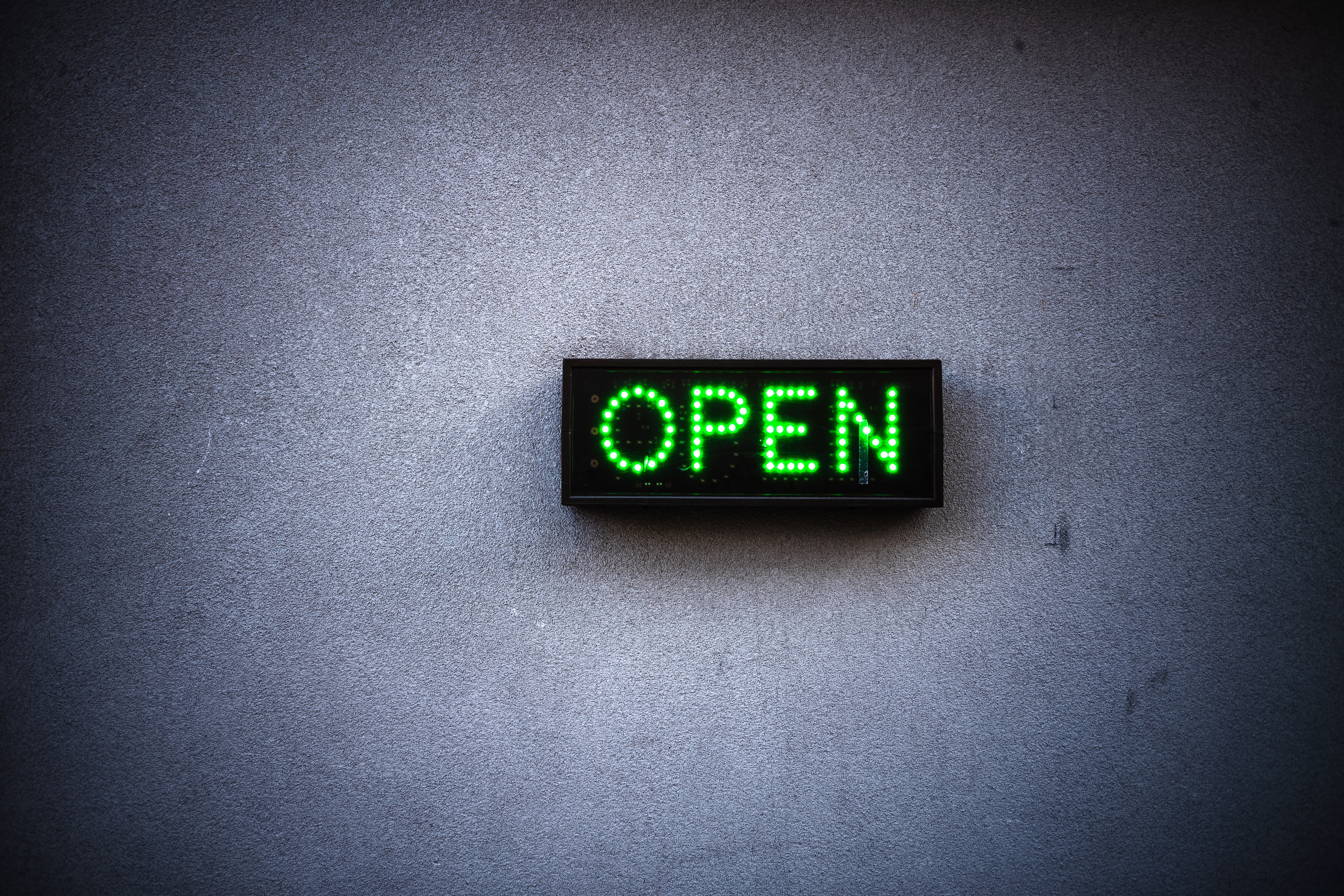A glowing green 'OPEN' sign stands starkly against a muted, textured gray wall, creating a striking contrast. The bright light emits a sense of warmth and welcome, inviting passersby into a space of possibility. The minimalist composition emphasizes the sign’s clarity and purpose in an otherwise subdued environment.