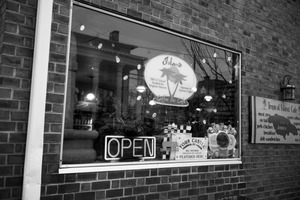 This black and white photograph captures the inviting exterior of a café, where a glowing 'OPEN' sign beckons passersby. The window reflects a charming ambiance with warm light illuminating the interior, adorned with playful decorations and signage that hints at a tropical theme. The composition draws the eye towards the café's vibrant yet cozy atmosphere, inviting a sense of nostalgia and community.