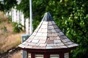 The photograph captures the intricate roof of a small structure, emphasizing its polygonal shape and textured shingles. Soft, natural light highlights the weathered tones of the materials, creating a serene and nostalgic atmosphere amidst a vibrant green backdrop. The blurred background subtly frames the roof, making it the focal point of the image.