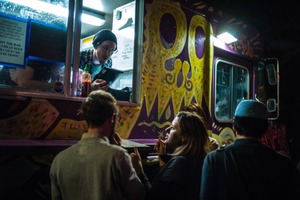 In a vibrant night scene, a food truck adorned with colorful graffiti serves a small group of eager patrons. The glow of the truck’s lights contrasts with the darkness, creating an inviting atmosphere that buzzes with anticipation and casual camaraderie. The expressions of the customers convey excitement and connection, emphasizing a moment of shared indulgence amidst the night.