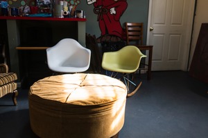 The photograph captures a unique, eclectic space with a warm, inviting atmosphere. A sunbeam highlights a round, plush ottoman at the center, while colorful chairs and playful wall art add character to the room. The soft lighting enhances the sense of comfort, making it a perfect spot for creativity and relaxation.