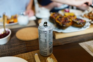A can of energy drink sits prominently in the foreground, drawing attention amidst a lively dining scene. The soft focus on the background reveals hands preparing food, conveying a sense of warmth and togetherness. Natural light spills in, enhancing the inviting mood of this shared meal experience.