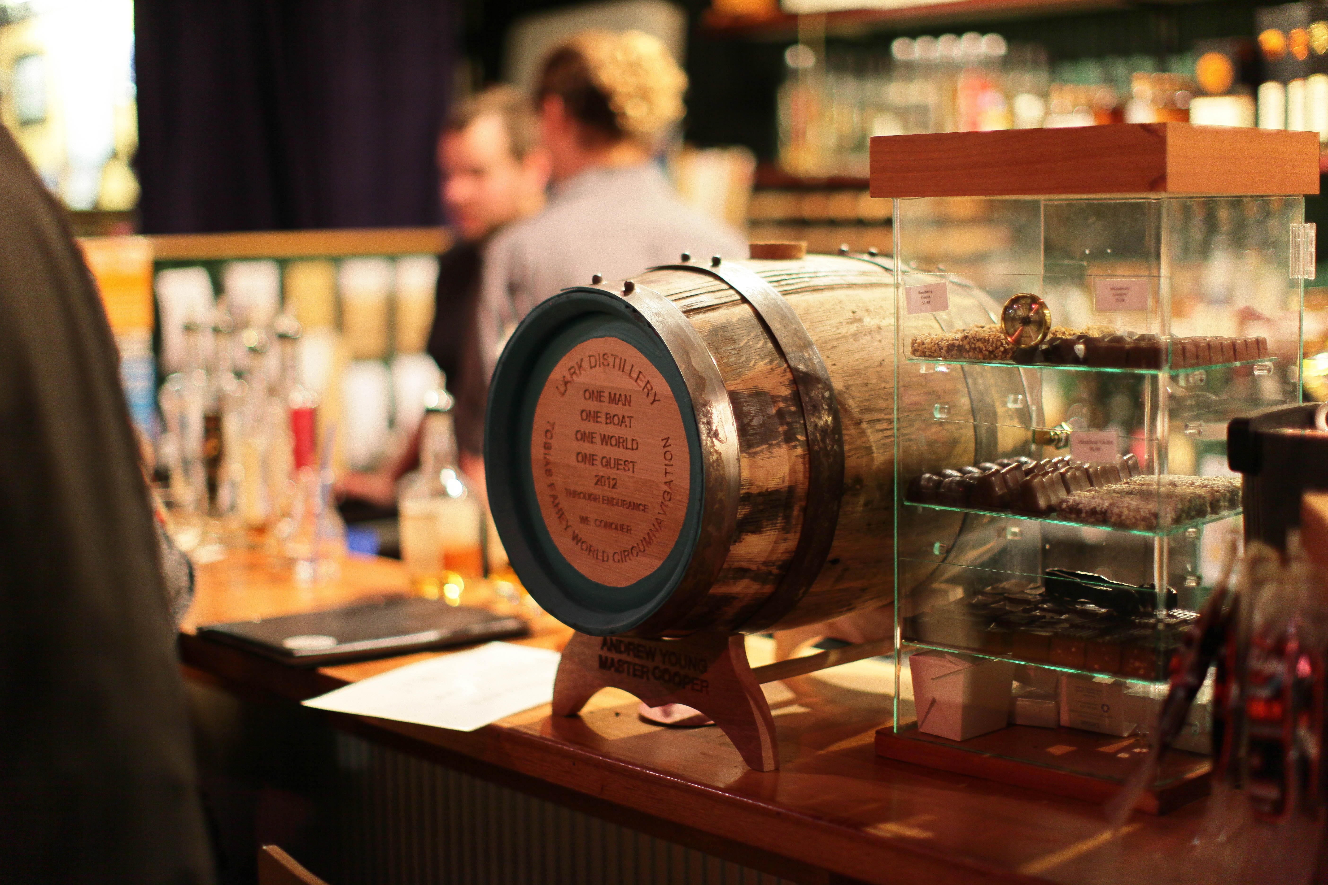 The photograph captures a rustic bar scene centered around a wooden barrel emblazoned with artisanal inscriptions. Warm, ambient lighting creates a cozy atmosphere, highlighting the indulgent selection of spirits and handcrafted items behind the glass display. The blurred figures of patrons in the background contribute to a lively, yet intimate mood of shared enjoyment and craftsmanship.