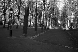 A serene park scene captured in black and white, where long shadows stretch across a winding path flanked by tall, bare trees. The composition invites solitude, with a lone figure disappearing into the distance, evoking a sense of reflection and tranquility. Soft lighting enhances the mood, bathing the landscape in gentle contrasts that highlight the stark beauty of winter’s embrace.