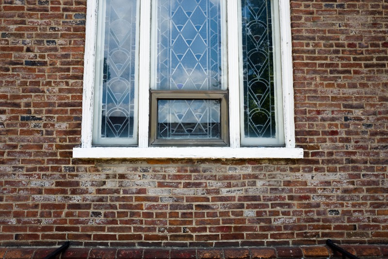 The photograph captures a well-worn brick wall framed by a set of three windows, each adorned with decorative glass that reflects hints of the outside world. The composition evokes a sense of history and resilience, accentuated by the soft, natural light that highlights the textures of both the bricks and the glass. This interplay of light and shadow creates a mood of subtle nostalgia and quiet contemplation.