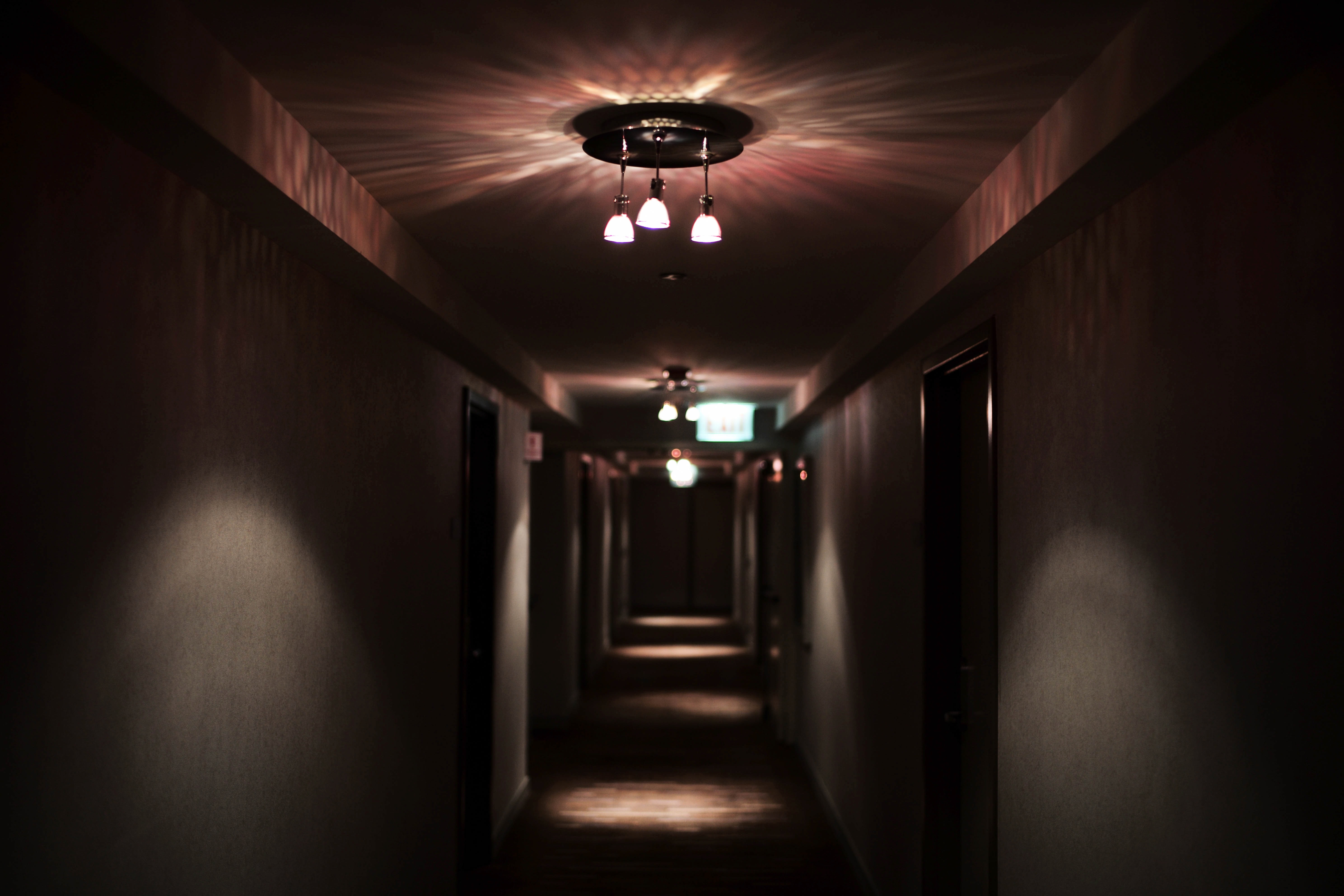 The photograph captures a dimly lit hotel hallway, inviting yet eerie, as soft light radiates from modern ceiling fixtures, casting intricate patterns on the walls. Shadows deepen the mood, while the perspective draws the eye towards an elusive exit sign at the far end, suggesting both mystery and solitude. The warm tones contrast with the cold, empty passage, creating an ambiance of quiet anticipation.