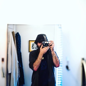 The image captures a self-portrait of a man in a mirror, holding a vintage camera with a playful yet contemplative expression. Soft light filters in from nearby windows, creating a warm and intimate atmosphere, while the surrounding textures of towels and framed art subtly hint at a personal space. The composition centers the subject, drawing the viewer into a moment of self-reflection and creativity.