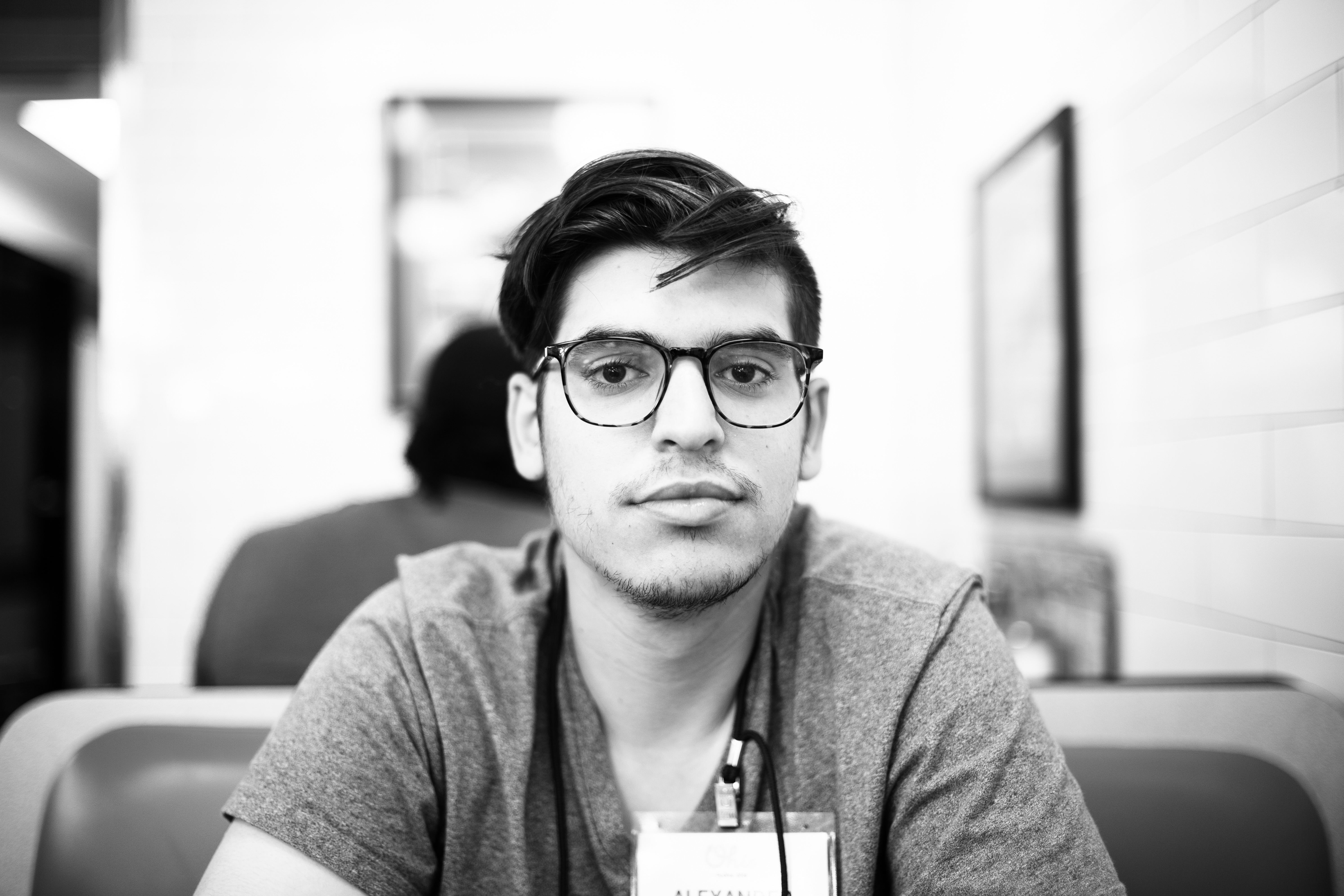 A young man gazes directly into the camera with a contemplative expression, framed by a retro diner ambiance. The stark black-and-white contrast emphasizes his thoughtful demeanor, while the soft background blur creates a sense of intimacy and focus. Subtle lighting enhances the contours of his face, adding depth to the overall mood of quiet introspection.