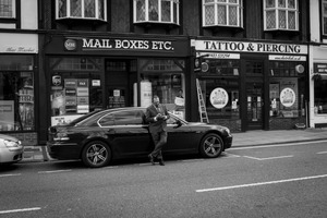 A suited man leans against a sleek black car, engrossed in his phone amidst a bustling urban backdrop. The contrasting storefronts of a mail service and a tattoo shop create a playful juxtaposition, enhanced by the monochromatic palette that adds a timeless quality to the scene. Soft, diffused lighting captures the nuances of the moment, evoking a sense of quiet contemplation in the midst of city life.