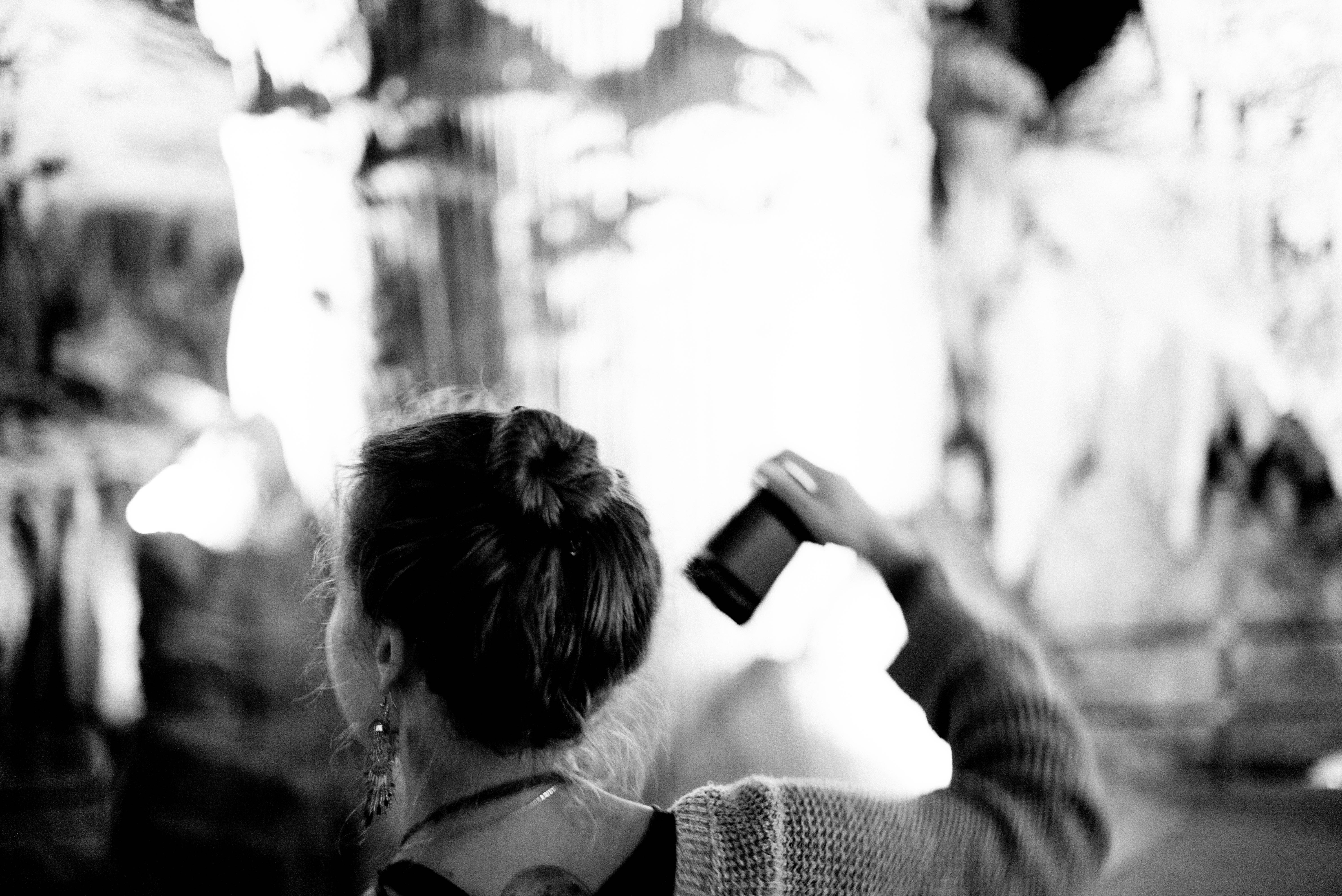 A solitary figure stands in the dim light of a cavern, capturing the ethereal beauty of stalactites and illuminated rock formations. The monochrome tones enhance the feeling of mystery, while the soft focus creates an intimate connection with the explorer's moment of discovery. The scene evokes a sense of wonder and adventure amid the natural wonders of the underground.