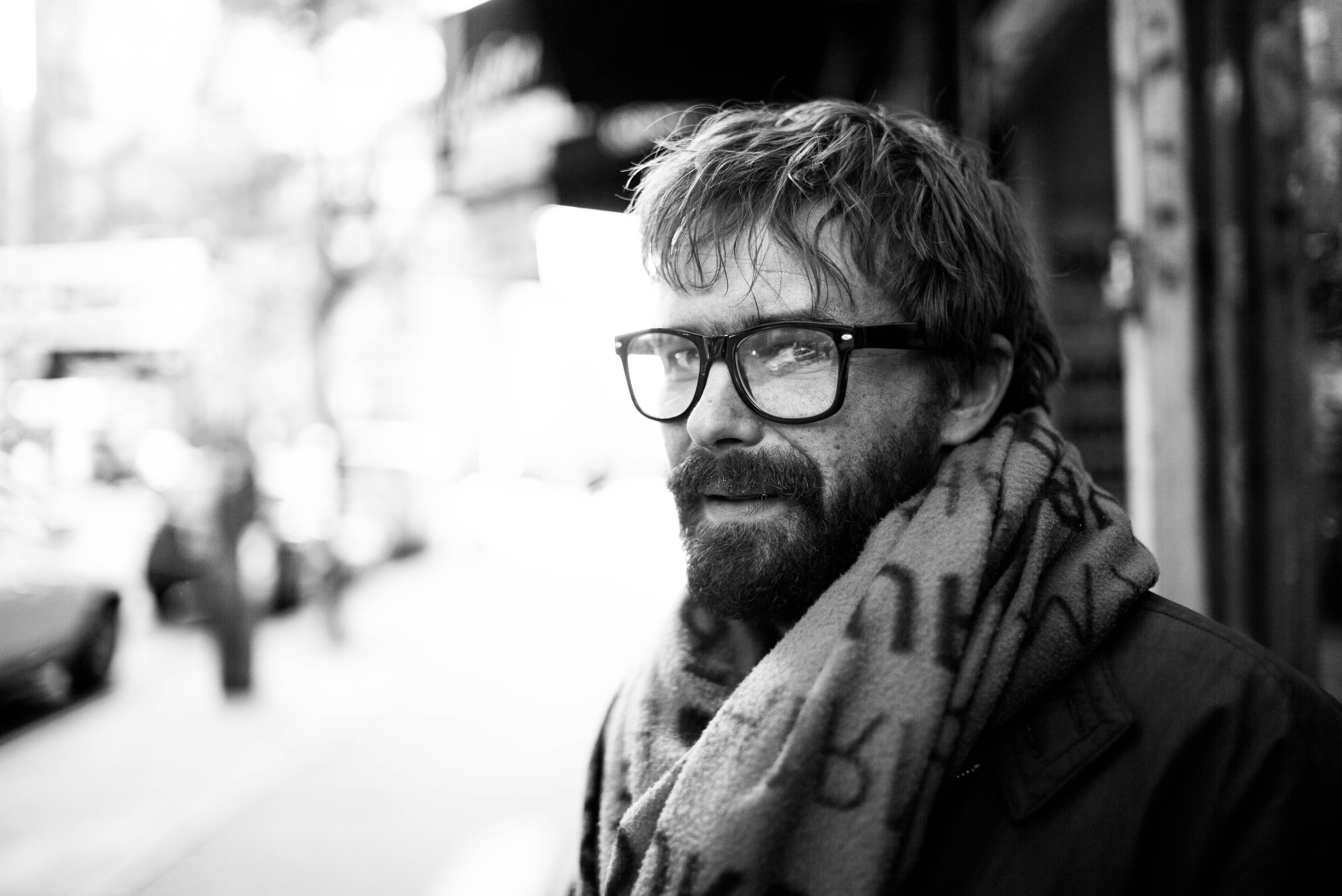 In this striking black-and-white photograph, a man with tousled hair and thick glasses stands against a blurred city backdrop. His facial expression conveys a blend of contemplation and warmth, while soft natural light highlights his features, creating a compelling contrast against the darker surroundings. The shallow depth of field draws attention to him, enhancing the intimate feel of the moment captured amid the urban hustle.