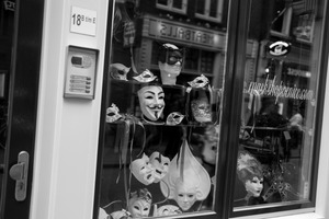 This photograph captures a window display filled with an array of intricate masks, evoking a sense of intrigue and playfulness. The stark black-and-white tones enhance the dramatic effect of the masks, casting shadows that further amplify their distinctive features. The composition draws the viewer's eye through the variety of shapes and textures, hinting at the stories and identities hidden behind each mask.