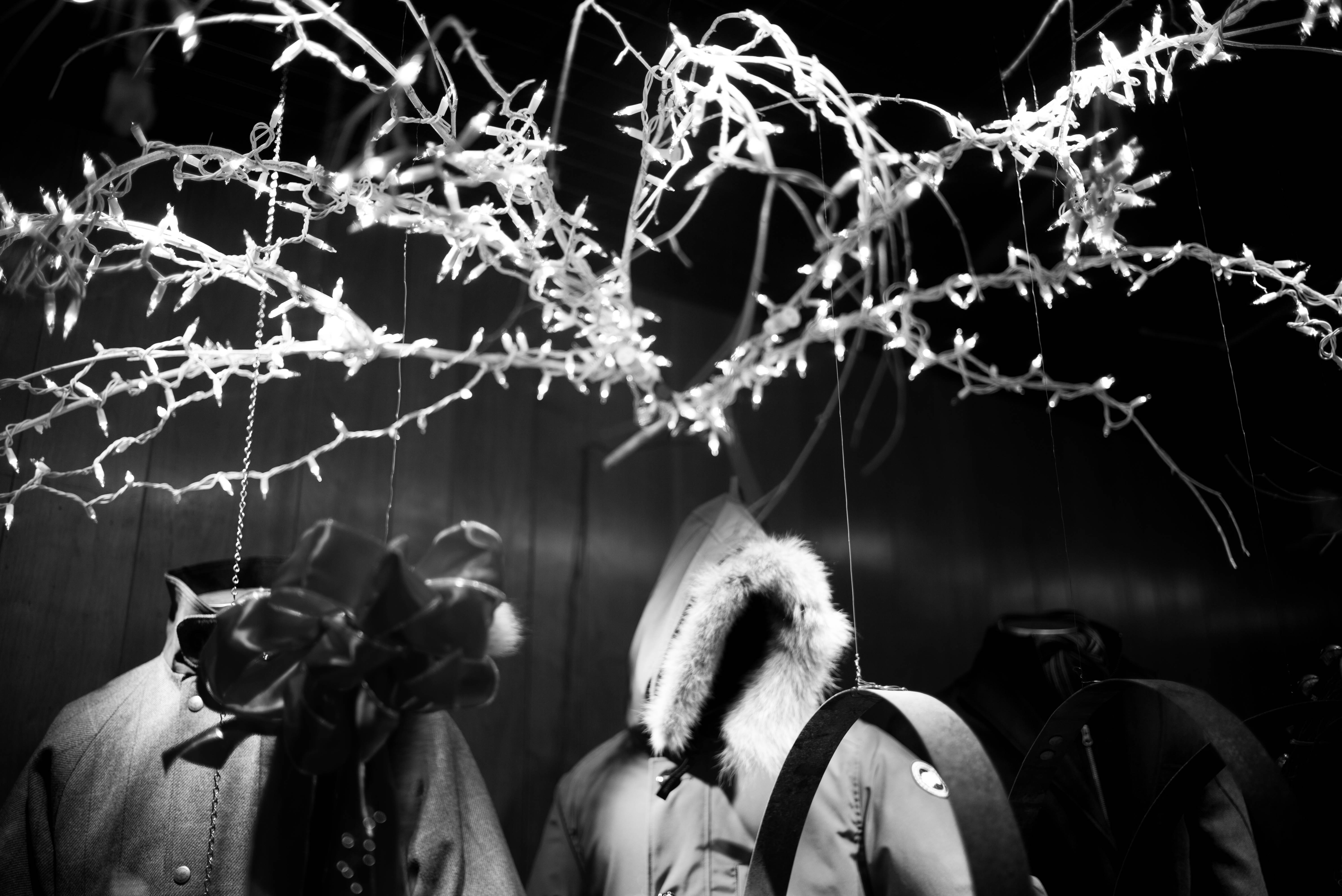 A moody display of winter jackets hangs in a dimly lit shop, contrasted by twinkling fairy lights above. The monochrome palette adds a timeless elegance, while a festive ribbon hints at the holiday spirit. The composition draws the eye to the textures of the garments, evoking warmth amidst the crisp season.