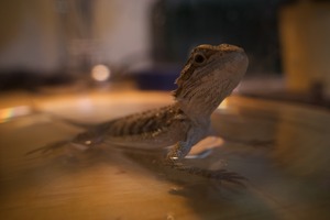 A bearded dragon is poised gracefully in shallow water, its textured skin glistening in soft, warm lighting. The close-up perspective draws attention to its inquisitive expression while ripples gently distort the surroundings, creating a tranquil atmosphere. The subtle blur in the background adds a dreamlike quality, enhancing the subject's serene moment of reflection.
