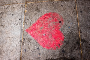A vibrant red heart painted on a weathered pavement captures a moment of love amidst the urban landscape. The worn texture of the concrete and scattered debris create a juxtaposition, adding a sense of character and nostalgia. Soft, diffused lighting enhances the heart's boldness, inviting contemplation on the subtle expressions of affection found in everyday life.