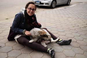 In a heartwarming scene, a woman sits on the ground, playfully interacting with a cheerful dog that leans affectionately against her. The casual composition and soft lighting evoke a sense of warmth and connection, highlighting the joy of companionship. The backdrop of a quiet street adds a serene ambiance, making this moment feel intimate and candid.