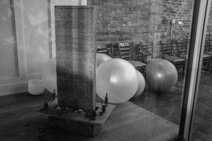The photograph captures a tranquil interior scene with a textured stone water feature standing serenely in the foreground. Soft lighting casts gentle shadows, enhancing the mood of calmness, while large transparent balls in the background hint at playful energy. The contrast between the solid, natural materials and the rounded, ethereal shapes creates a captivating visual balance.
