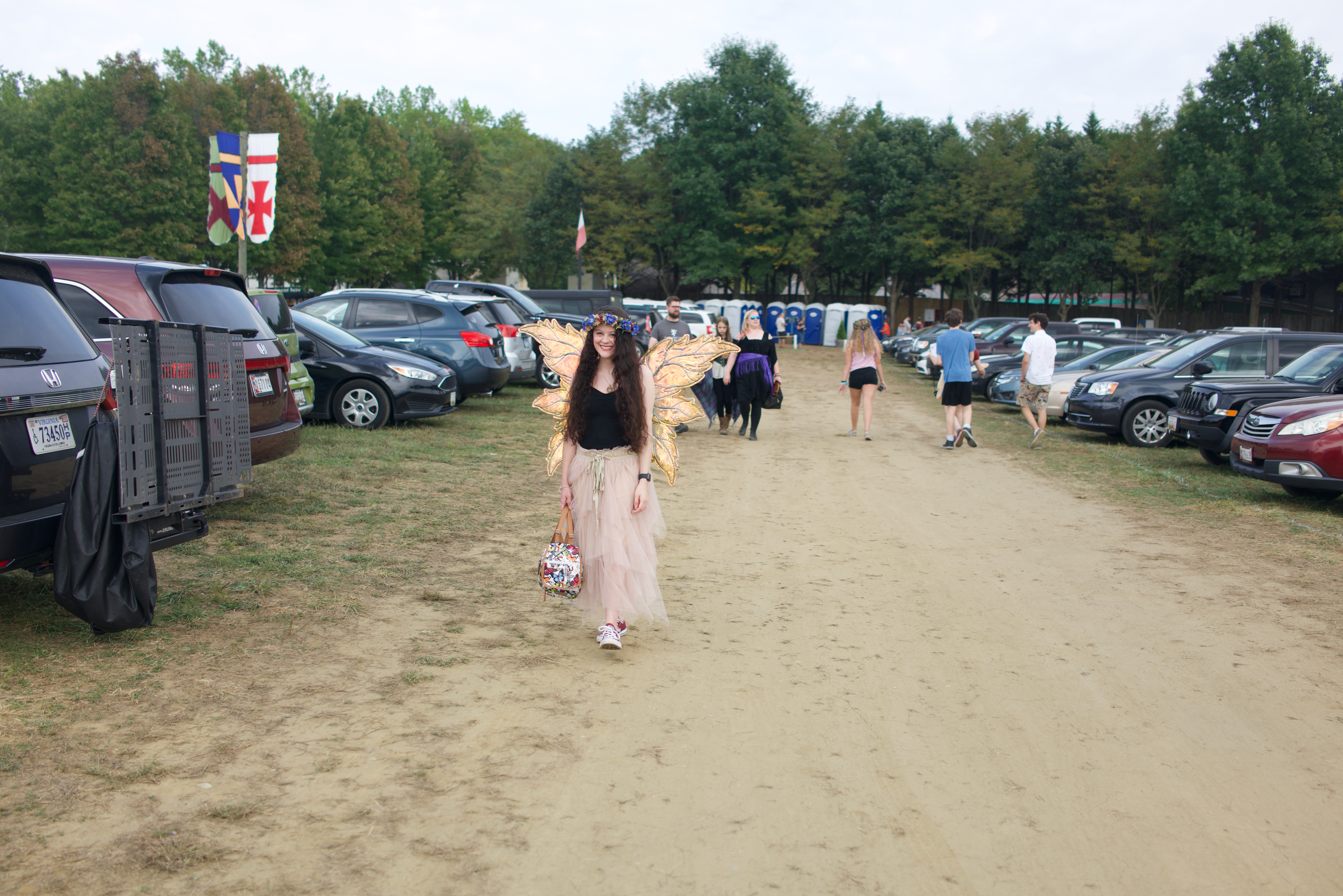 The photograph captures a whimsical figure dressed as a butterfly, confidently striding down a dusty path lined with parked cars. Her vibrant wings contrast with the subdued tones of the surrounding parking lot, creating a playful and dreamlike mood. The soft, natural lighting highlights her ethereal costume while casting gentle shadows, evoking a sense of enchantment amid a mundane setting.