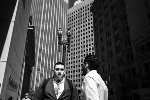 In this striking black and white photograph, two men engage in a moment of conversation amid towering skyscrapers. The composition emphasizes the vertical lines of the buildings, contrasting sharply with the figures in the foreground, creating a sense of intimacy amidst the bustling urban environment. The harsh midday light casts dramatic shadows, enhancing the mood with an air of seriousness and focus.