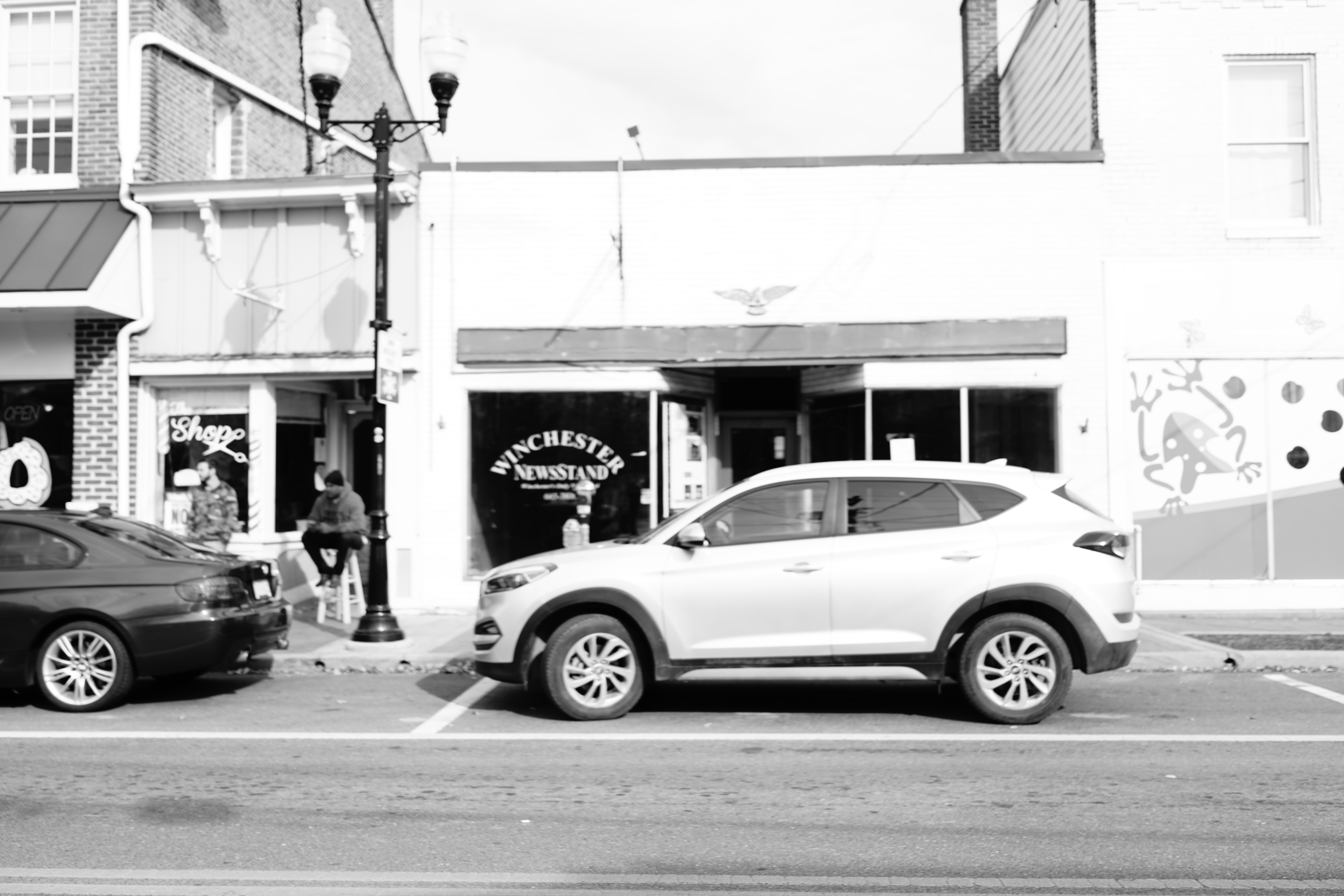 The photograph captures a serene street scene in black and white, where a lone figure sits casually on a bench outside a shop. The composition is balanced with parked cars lining the street, juxtaposed against the warm façade of brick buildings, while the soft daylight creates a nostalgic atmosphere. The mood is calm and reflective, evoking a sense of everyday life unfolding in a quaint town.