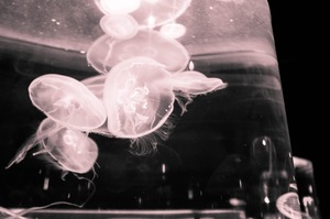 This photograph captures the serene and fluid movements of jellyfish gliding through water, illuminated by soft, ambient light. The composition emphasizes the delicate, translucent forms of the jellyfish against a dark background, creating a dreamlike atmosphere. The muted tones enhance the ethereal mood, inviting viewers to ponder the mysterious beauty of marine life.