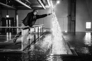 A man leans forward, pointing toward a dramatic cascade of water pouring from an overhead source, creating an impactful visual moment. The stark black and white tones enhance the tension, while the reflective surfaces of the water create a moody atmosphere. The composition captures the dynamic interaction between the subject and the rushing water, evoking a sense of urgency and wonder.