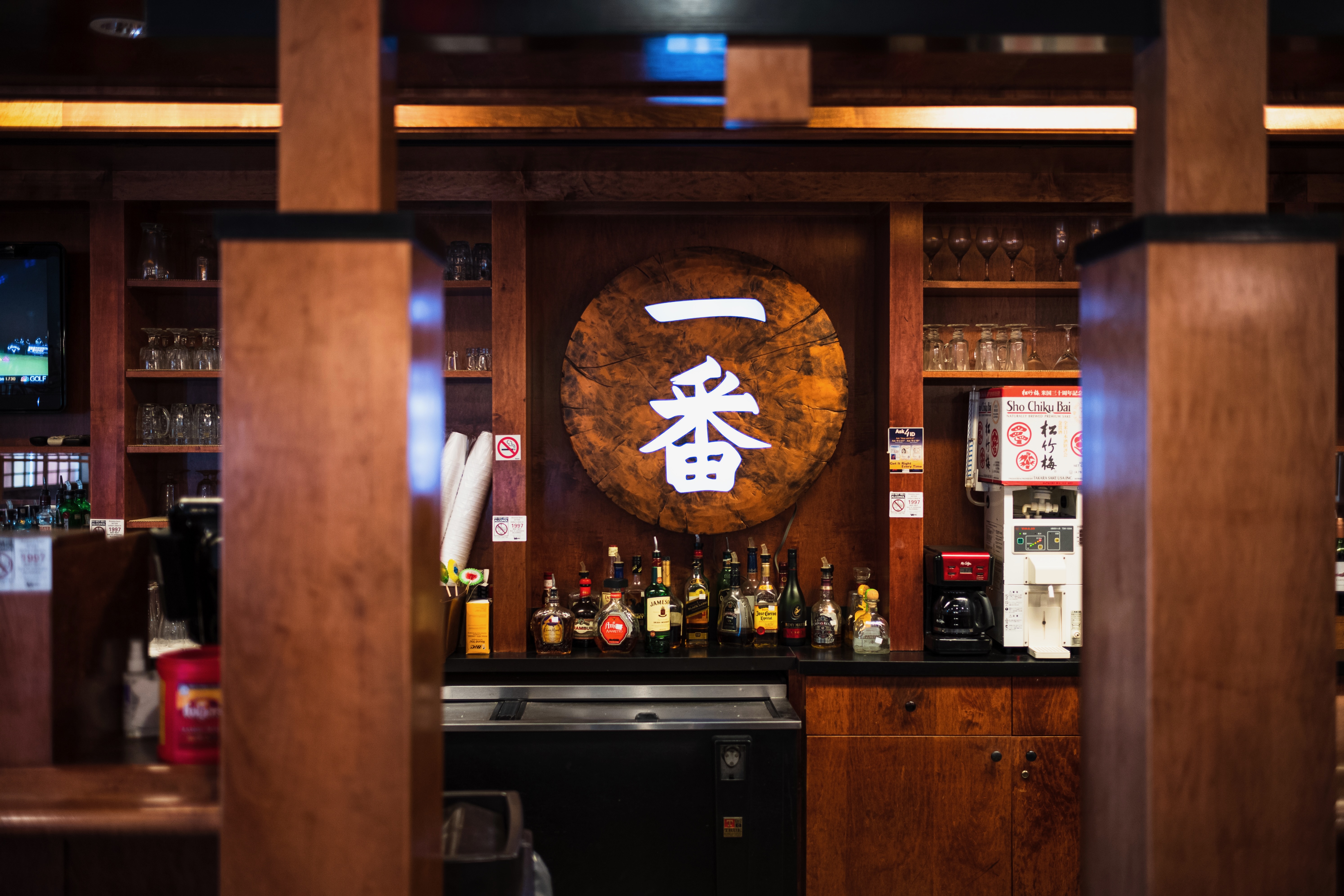This photograph captures a cozy bar scene where polished wooden panels create a rich, inviting atmosphere. The warm lighting highlights an array of colorful bottles beneath an intriguing circular sign featuring Japanese characters, evoking a sense of cultural charm. Framed by wooden supports, the composition draws the eye toward the intricacies of the bar, blending craftsmanship and ambiance seamlessly.