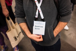 The photograph captures a close-up of a person casually dressed in a gray sweater, holding a name badge that reveals their identity and affiliation. The lighting is bright but not harsh, creating a welcoming and informal atmosphere at what appears to be a bustling conference. Soft blur in the background adds depth, hinting at other attendees engaged in conversation, enhancing the social and professional mood of the setting.