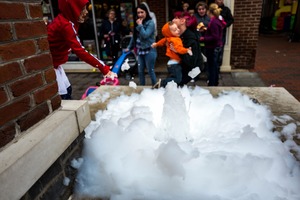 A scene filled with laughter and excitement, this photograph captures children playing exuberantly in a sea of white foam. The playful contrast of the bright red hoodie against the muted background evokes a sense of joyful chaos, enhanced by the splashes of foam. The soft, diffused lighting lends a whimsical charm to this lively moment.