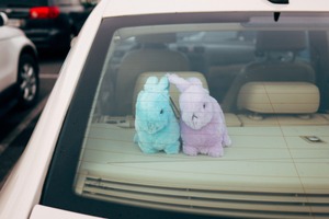 Two plush bunnies, one blue and one purple, rest peacefully on the back seat of a white car, peering out through a slightly foggy window. The soft hues of the toys contrast gently with the muted tones of the parking lot, evoking a sense of innocence and nostalgia. The melancholic lighting adds to the whimsical allure, capturing a moment of quiet charm amidst the bustle of daily life.