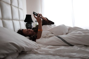 A young woman lounges on a soft, unmade bed, illuminated by gentle natural light filtering through sheer curtains. The mood is relaxed and intimate, emphasizing a moment of solitude as she engages with her phone, surrounded by the comfort of a cozy, disheveled space. The composition features a balance of soft textures and shadow, creating a serene atmosphere perfect for a lazy morning.