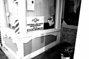 This photograph captures a neighborhood storefront, with a bold advertisement for football and cheer registration prominently displayed in black and white. The stark contrast and shadows create a nostalgic mood, evoking a sense of community engagement and local tradition.