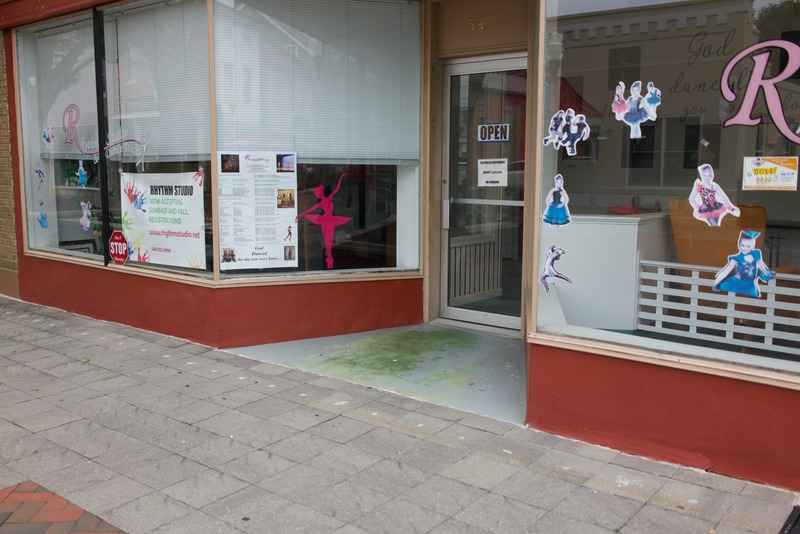 This photograph captures the inviting exterior of a dance studio, adorned with bright, playful cutouts of young dancers that embody joy and creativity. The soft, natural lighting bathes the scene, highlighting the vibrant colors of the signage against a backdrop of muted tones, evoking a sense of community and artistic expression. Despite the slight blemish on the pavement, the overall atmosphere remains cheerful and encouraging, inviting passersby to engage with the world of dance.