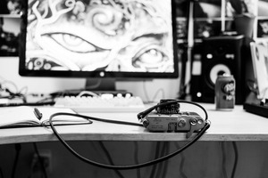 In a monochromatic workspace, an old-fashioned Leica camera rests on a wooden desk, its cord snaking across an open notebook. The background features a computer monitor displaying a striking graphic of intense eyes, creating a contrasting blend of vintage and modern artistry. Soft lighting bathes the scene, evoking a contemplative mood amidst creative chaos.