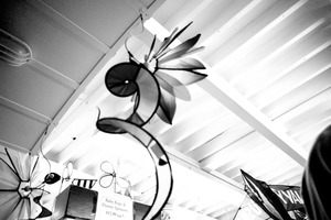 A striking black and white photograph captures an intricate metal sculpture, spiraling upwards against a backdrop of wooden beams. The soft, diffused lighting enhances the whimsical shapes of the artwork, creating a dreamlike atmosphere. This composition invites the viewer to explore the delicate interplay of forms in an intimate setting.