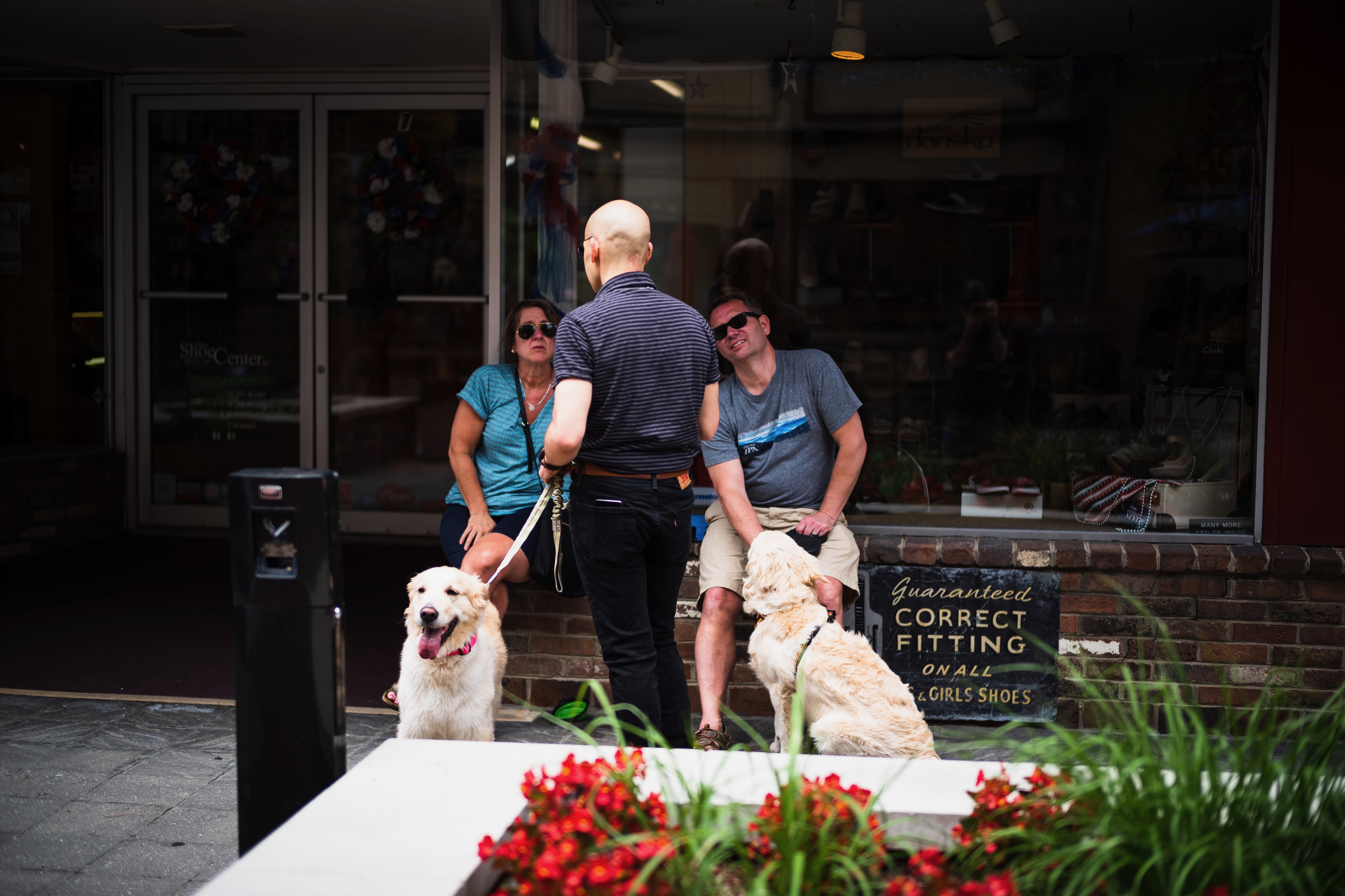 In a vibrant urban setting, two people relax on a bench while engaging in conversation with a man holding two leashes to golden retrievers. The interaction is lively and friendly, with plants and flowers adding a splash of color to the scene. Soft, diffused lighting enhances the casual atmosphere, creating a moment of warmth and camaraderie in the heart of the city.