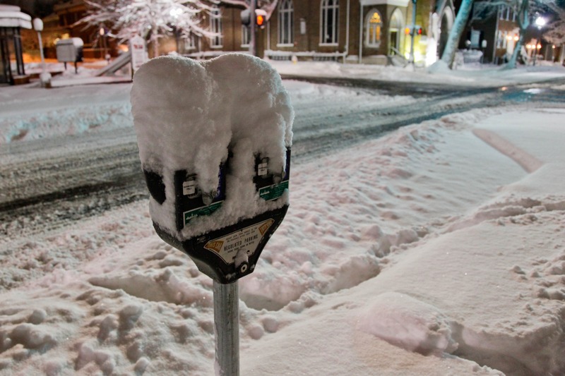 A solitary parking meter stands covered in a thick layer of fresh snow, evoking a sense of stillness and winter’s grip on the urban landscape. Soft, ambient lighting bathes the scene, contrasting the dark road and nearby buildings that shimmer with holiday lights. The composition captures a serene, almost nostalgic moment, where everyday objects are transformed by nature's touch.