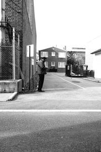 In this stark black-and-white photograph, a solitary figure stands at the edge of an alley, seemingly absorbed in his phone while surrounded by remnants of urban life. The harsh lighting and stark contrasts amplify a sense of isolation, with the buildings looming around him like silent witnesses to his solitude. The composition draws the eye towards the man's stillness amidst the bustling city, creating a poignant narrative of modern disconnection.