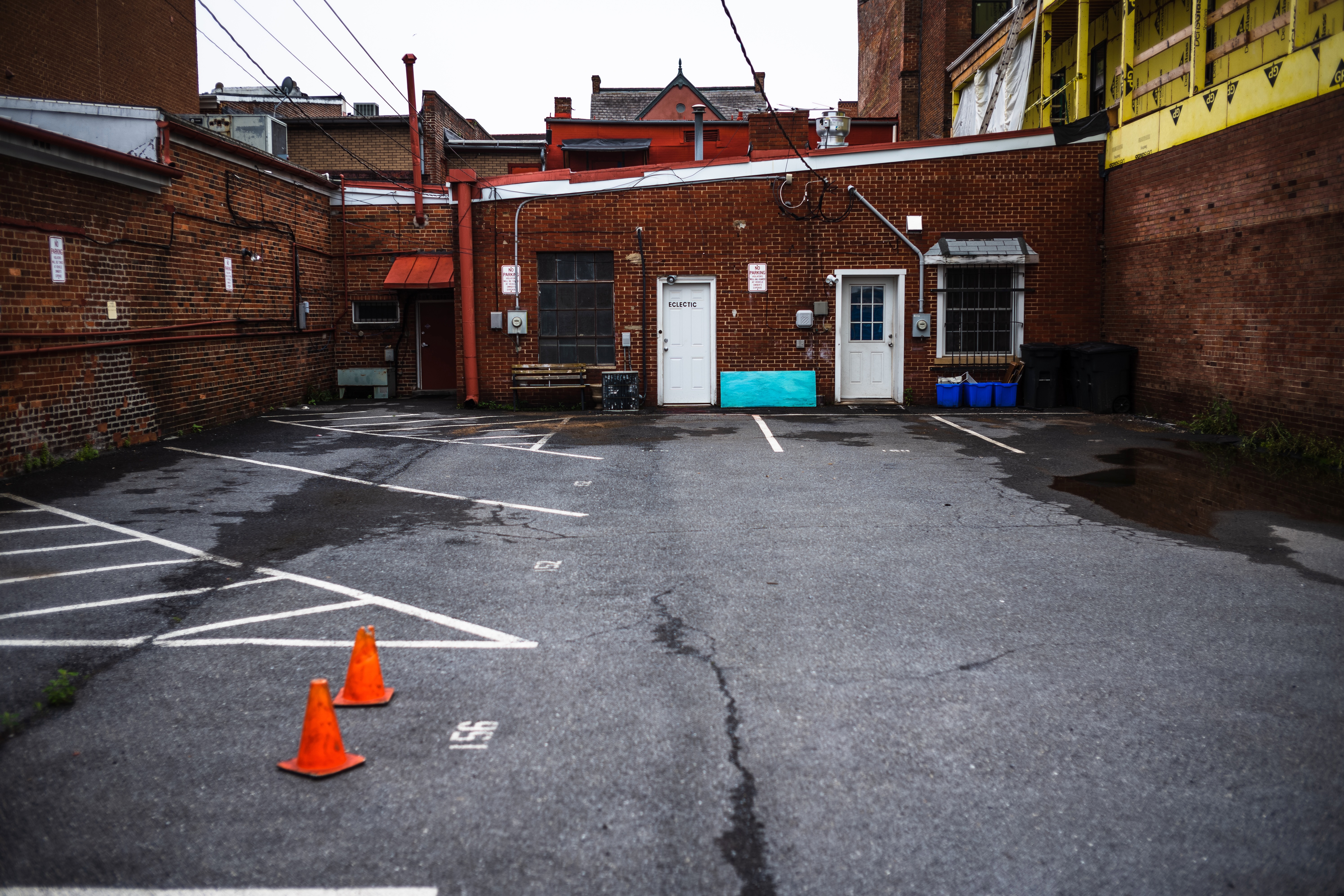 This photograph captures an empty parking lot flanked by brick buildings, exuding a sense of desolation and neglect. The muted lighting reflects recent rain, with puddles pooling on the asphalt, enhancing the somber mood. A pair of orange cones punctuates the composition, drawing the eye into the abandoned space, while the faint hints of color from doors and dumpsters suggest life amidst the stillness.