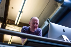 In this candid capture, a man leans over a desk adorned with an Apple computer, his expression reflecting a mix of concentration and warmth. The ambient lighting casts soft shadows, creating a relaxed atmosphere, while the industrial elements in the background add depth and character to the workspace. This moment embodies a fusion of creativity and technology, inviting viewers into an intimate professional setting.