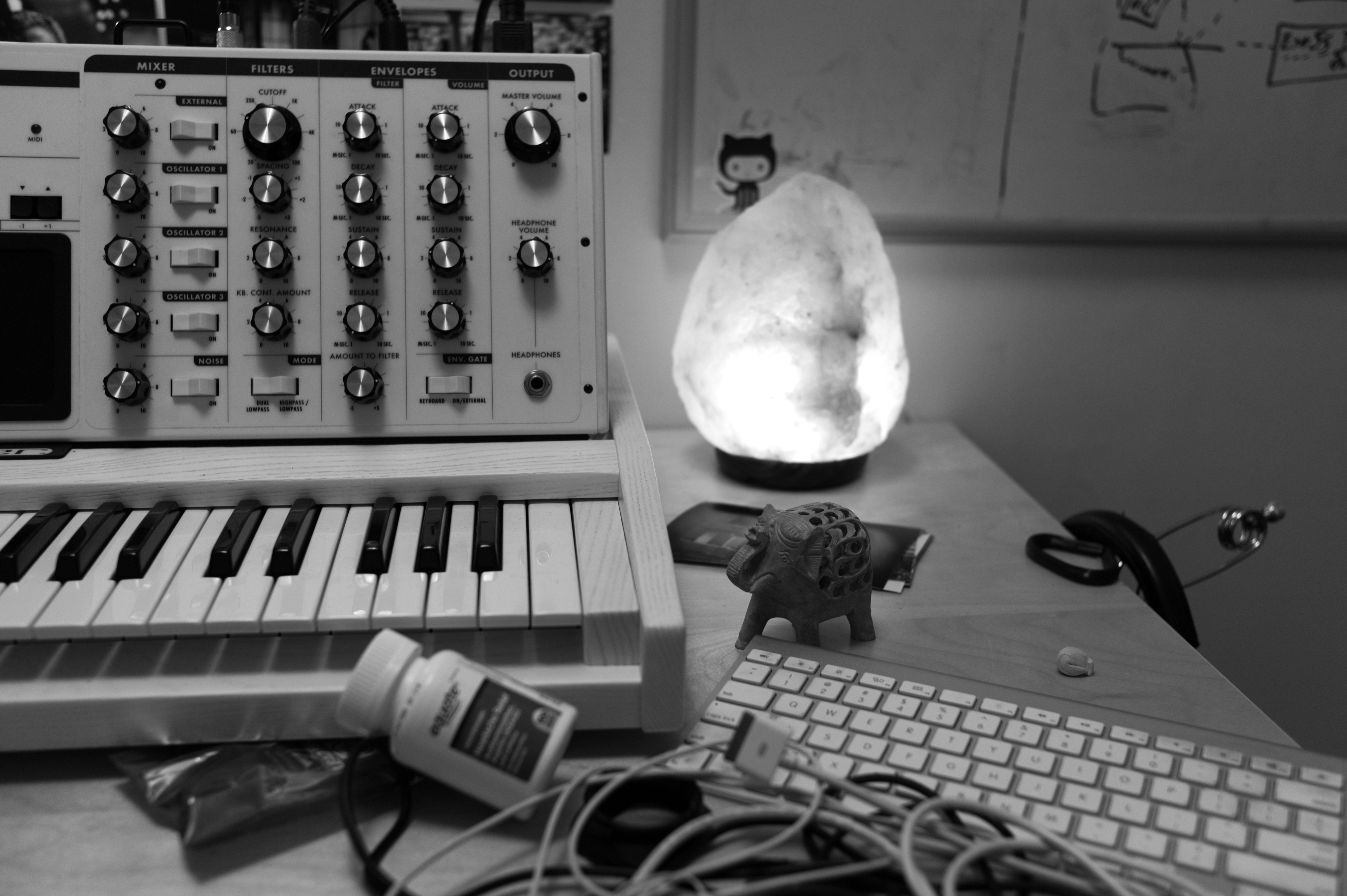 A monochromatic scene filled with a variety of textures and objects, the photograph captures a synthesizer and keyboard unifying the space, accompanied by tangled cables and a whimsical figurine. The soft glow of a salt lamp adds warmth against the muted tones, creating a contrast that evokes creativity amidst a cluttered workspace. This environment reflects the intimate relationship between music production and personal expression, steeped in an inviting yet chaotic ambiance.