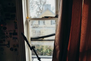 This photograph captures a moment of quiet introspection, viewed through a sunlit window. The fading light enhances the nostalgic feel, contrasting with the handwritten notes and clutter that hint at a busy mind. The interplay of shadows and soft tones invites the viewer to reflect on creativity and the passage of time within a personal space.