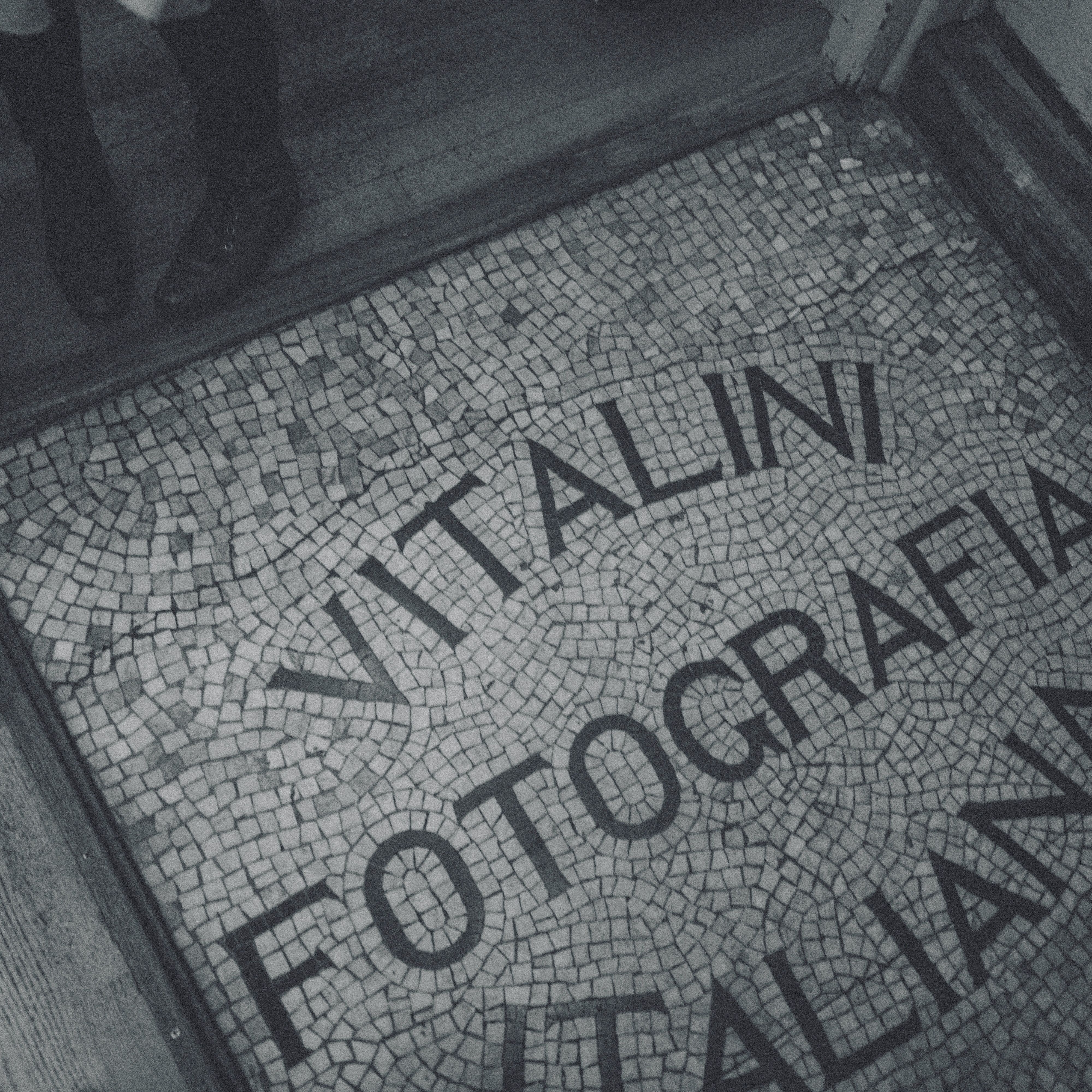 The photograph captures a close-up of a tiled floor bearing the name 'Vitalini Fotografia' in bold lettering, evoking a sense of nostalgia and artistic heritage. Soft, muted lighting casts gentle shadows across the mosaic, enhancing its textured details and the warmth of the aged tiles. The presence of a shoe subtly hints at the human connection to this artistic space, inviting viewers to consider the stories that unfold within.