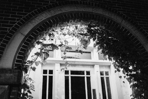 Framed by an ornate brick archway, the entrance to the Medical Arts building is subtly enveloped by creeping vines, evoking a sense of nature reclaiming its space. The monochrome tones lend a timeless, contemplative mood to the scene, enhancing its architectural details and casting soft shadows. Light filters through the greenery, creating an interplay between concealment and revelation, inviting viewers to ponder the stories within.