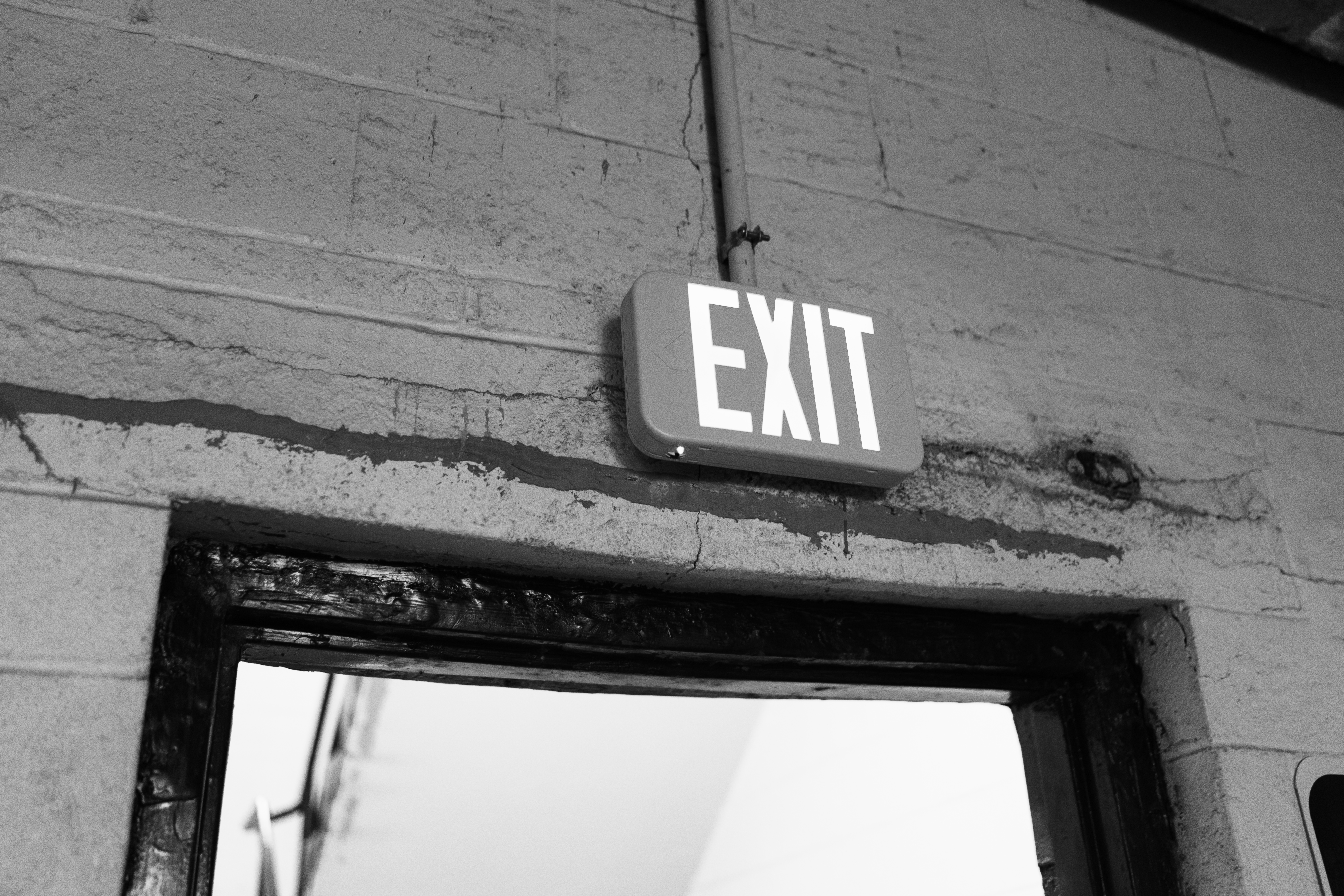 A stark black-and-white photograph featuring a bright 'EXIT' sign above an unadorned doorway. The mood is one of quiet urgency, marked by the contrast between the illuminated text and the textured, worn wall. The simplicity of the composition directs the viewer's attention to the notion of leaving, evoking feelings of both escape and possibility.