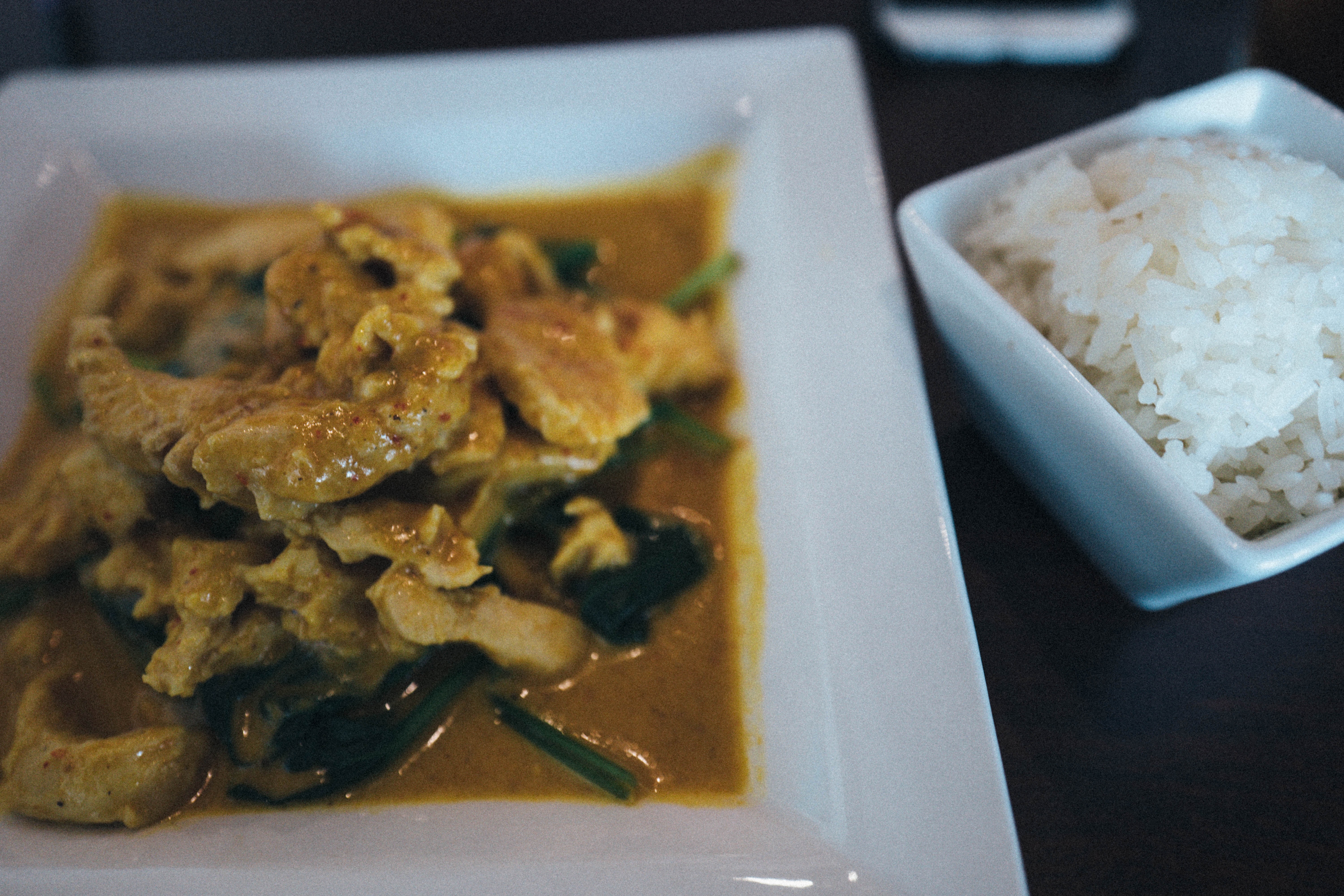 This photograph showcases a vibrant dish of chicken curry, artfully arranged with tender pieces of meat mingling with a rich, golden sauce and sprinkled with green herbs. Accompanied by a small bowl of fluffy white rice, the composition feels inviting and warm, inviting the viewer to savor the meal. Soft, natural lighting enhances the dish's appetizing colors, creating a cozy and inviting atmosphere.