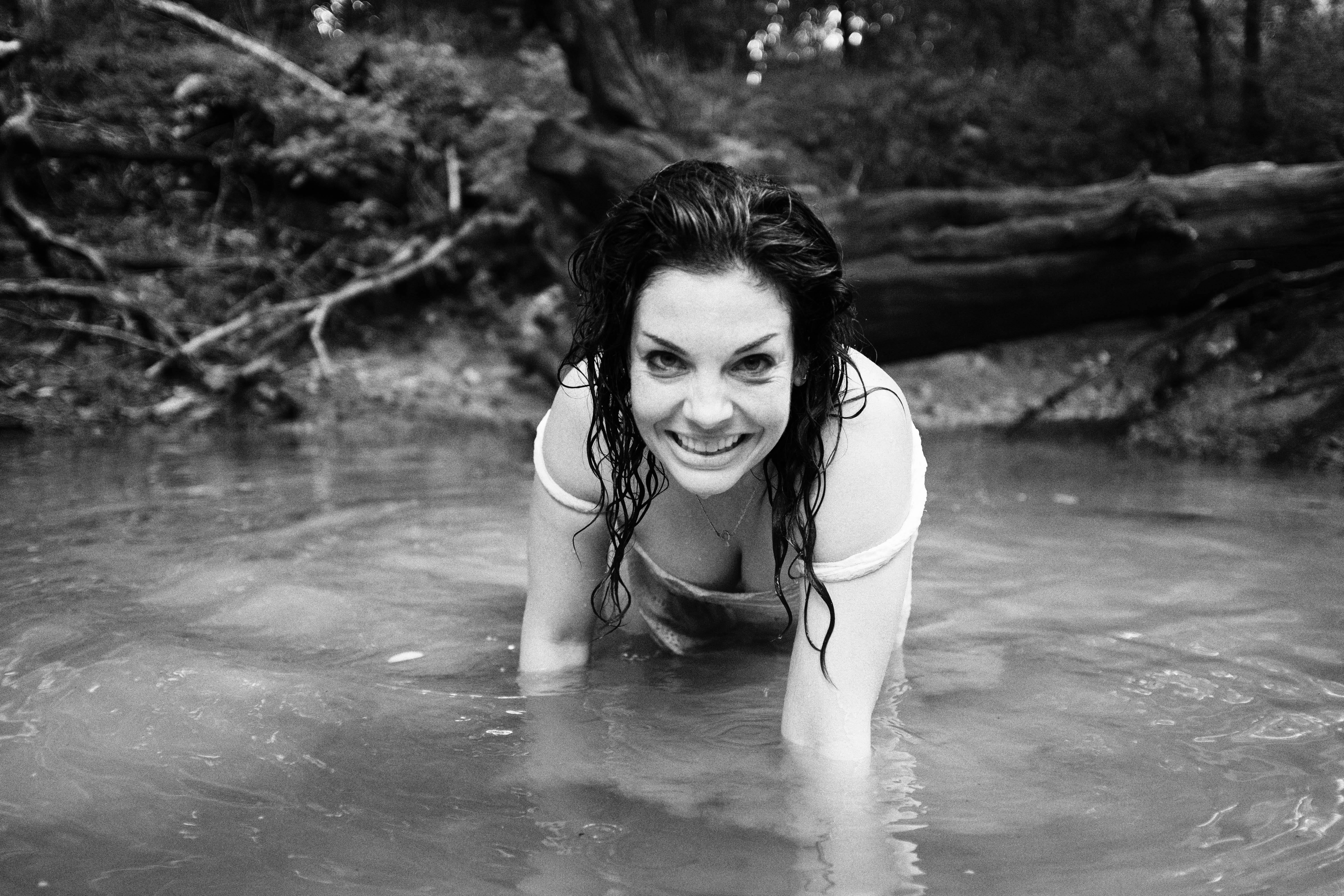 A woman crawls playfully in shallow water, her gaze radiating joy and mischief. The soft black-and-white tones create a nostalgic atmosphere, highlighting her wet, tousled hair and the natural surroundings. The composition draws the viewer into an intimate moment, evoking a spirit of freedom and connection with the earth.