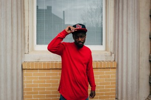 This photograph captures a young man in a vibrant red long-sleeve shirt and a cap, striking a bold pose against a textured brick backdrop. The soft natural light highlights his expressive gaze, conveying a sense of confidence and individuality. The composition draws attention to the subject, emphasizing his personality amidst the muted architectural details behind him.