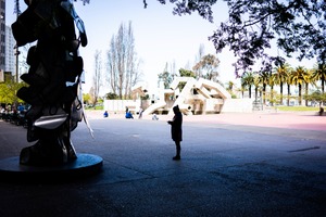 The photograph captures a lone figure silhouetted against the vibrant backdrop of a public park, anchored by a striking sculpture on one side. Sunlight gently filters through the surrounding trees, casting a serene ambiance as other park-goers engage distantly in leisurely activities. The composition melds urban art with nature, evoking a mood of tranquility and introspection amidst the lively environment.